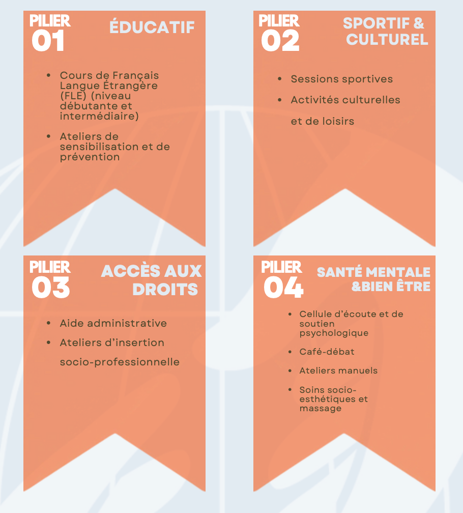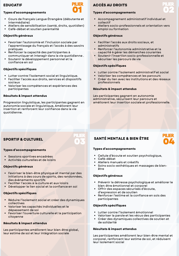 Actions : Programme d’accompagnement des femmes, avec un focus sur les mères isolées, combinant ateliers éducatifs, activités sportives et culturelles et soutien parental, renforcement de la cohésion sociale et promotion de l’empowerment.