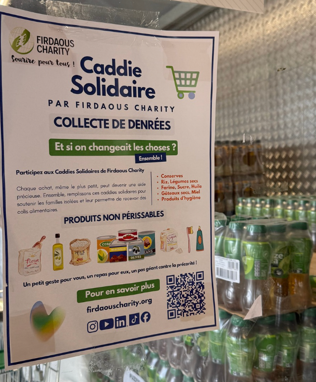 Le samedi 1er mars 2026, Firdaous Charity s’est mobilisée au magasin H Market à Aulnay-sous-Bois pour organiser une collecte de denrées alimentaires. De 11h à 17h, les bénévoles ont été présents en magasin afin de sensibiliser les clients et de recueillir des produits destinés aux futures distributions de l’association.